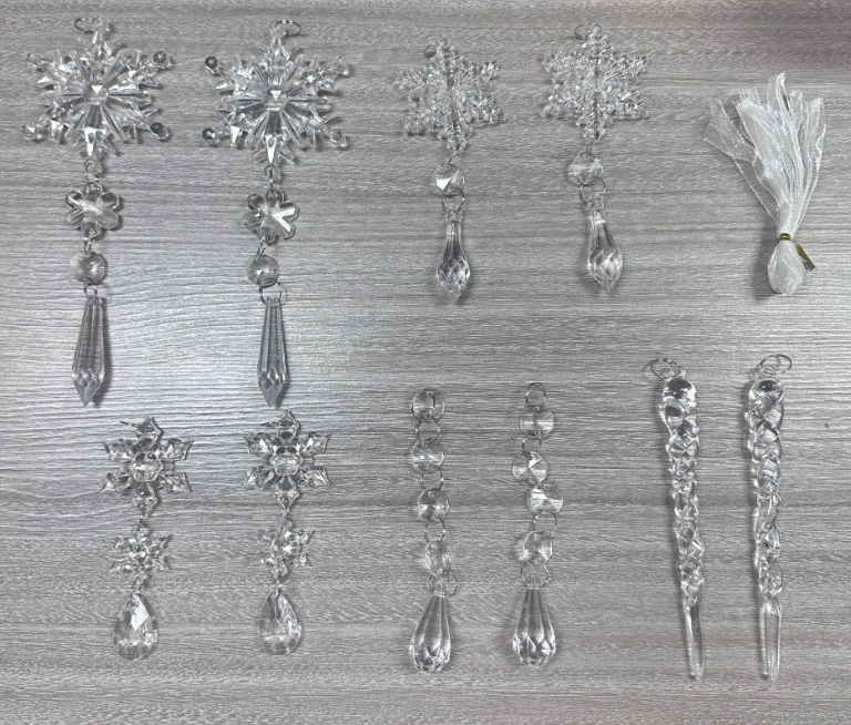 Clear acrylic icicle/snowflake ornaments with hanging holes and ribbon for easy decoration on Christmas trees, fireplaces, and more.