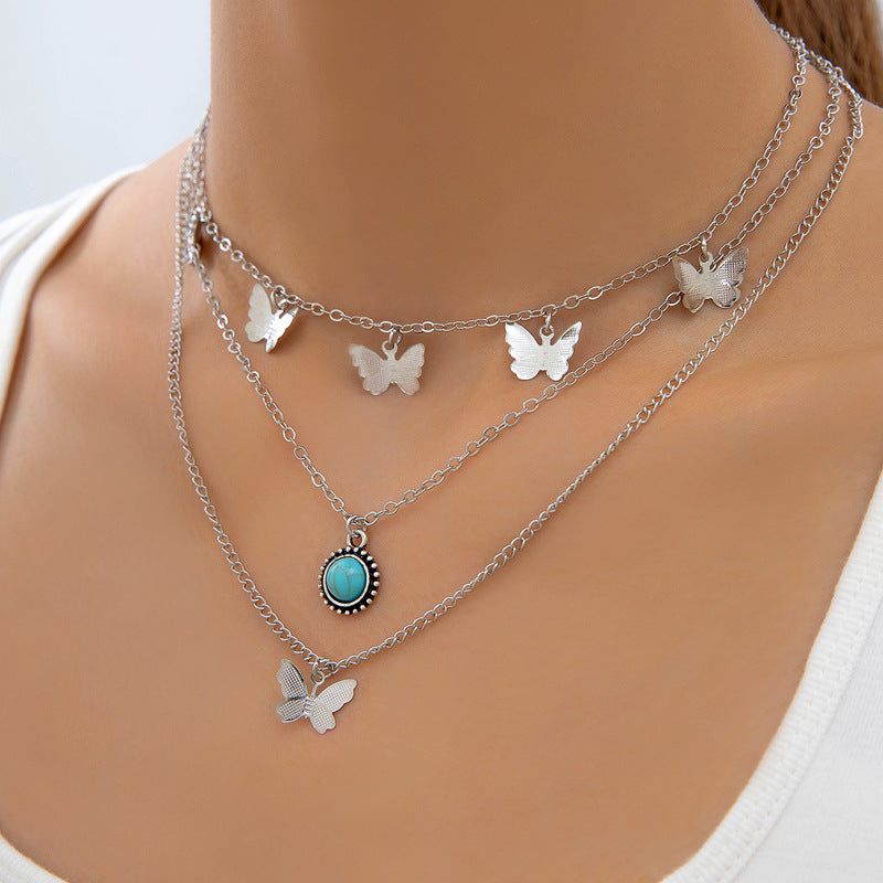 Ornament Retro Ethnic Style Simple Alloy Tassel Butterfly Inlaid Turquoise Multi-layer Necklace For Women