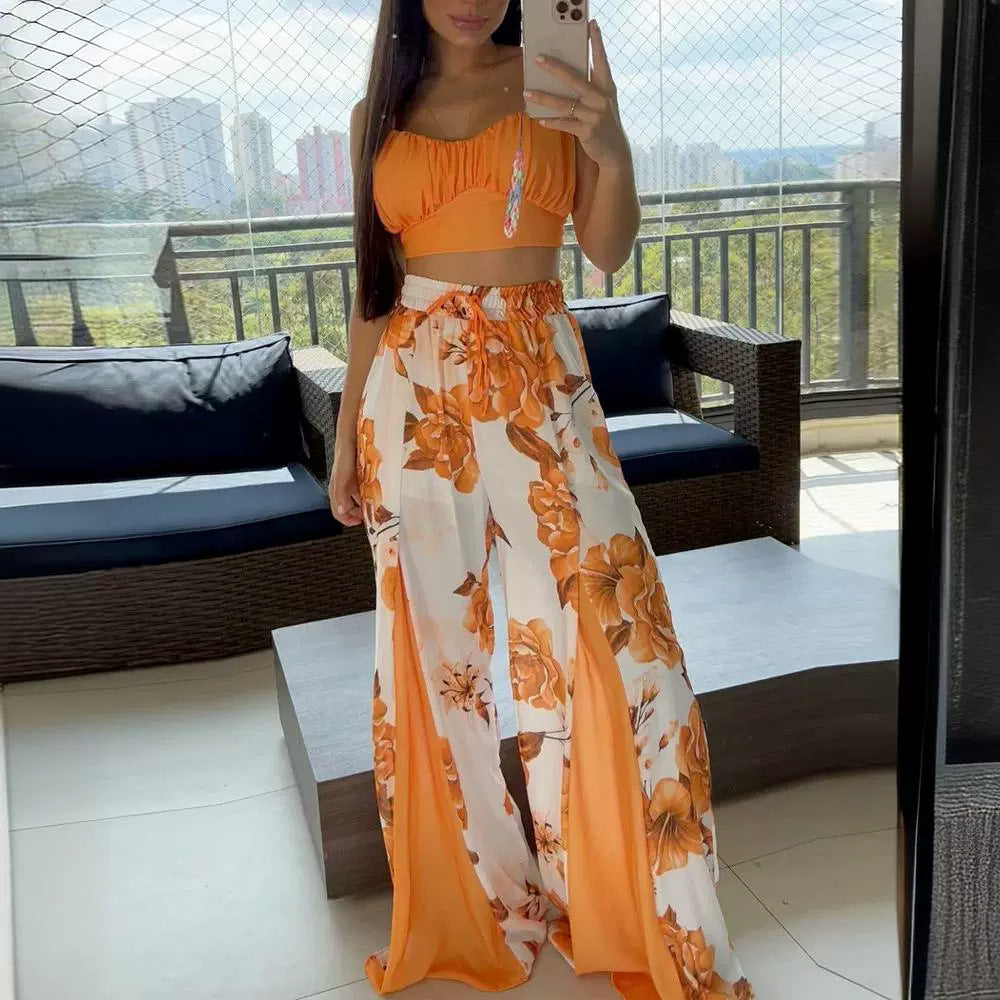 Solid Color Pleated Suspender Vest Floral Print Stitching Wide-leg Pants