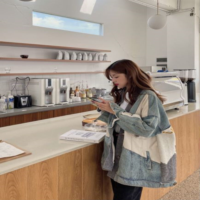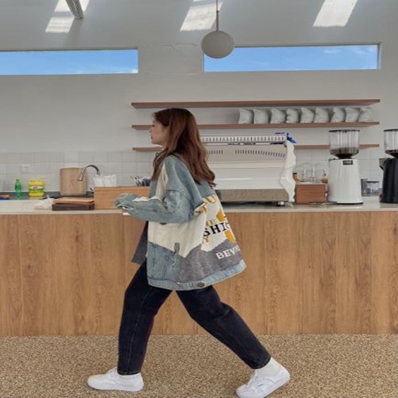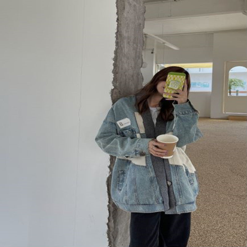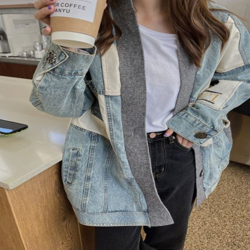 Women's Patchwork Knitting Design V-neck Loose Denim Jacket
